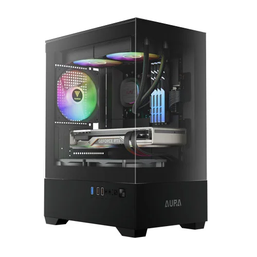 Features:Seamless Tempered Glass Display3 Built-in 120mm ARGB FansTool-Free InstallationMagnetic Dust FilterSupports Mini-ITX and Micro-ATX MotherboardsThe AURA GC9M ARGB Series, offers a compact panoramic design with three built-in ARGB fans, enhanced compatibility, and tempered glass front and side panels to showcase your build’s aesthetics.THREE BUILT-IN ARGB FANSThe case comes with three ARGB fans, with two preinstalled 120mm reverse intake fans at the bottom and one 120mm fan on the rear exhaust, providing excellent airflow and stunning ARGB visuals via the motherboard or LED control button.SIMPLE CLASP MECHANISMThe AURA GC9M ARGB showcases your system’s inner beauty with panoramic tempered glass and a tool-free clasp mechanism for easy access, offering a perfect view and enhancing your modding experience.OPTIMIZED FORMThe compact micro-tower case supports the installation of GPU lengths up to 280mm, a PSU shroud design, and a depth with ample room for cable management optimization.COOLING SUPPORTThe case comes with 3 ARGB fans, supports up to 5 fans, and provides flexible installation options for radiators at the top and rear.SIMPLE AND ACCESSIBLEThe I/O is equipped at the top side of the case, featuring 2x USB port, 1x USB 3.0 port, a LED switch button, and additional audio connectivity.Radiator Support:Top: 2 x 120mm ( Radiator length < 278mm)Rear: 1 x 120mmFan Support:Top: 2 x 120mm Rear: 1 x 120mmBottom: 2 x 120mm